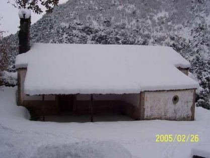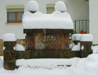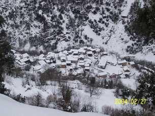Cabaña de teito nevada cerca del pueblo,