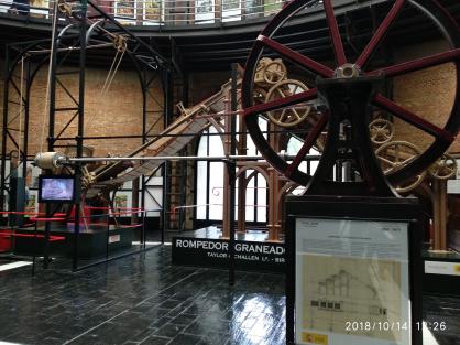 Casa del Explosivo, un espacio dedicado a la evolución de esta industria desde los tiempos de Alfred Nobel. La pieza principal es el Graneador de Congreve, una imponente máquina de finales del siglo XIX (fabricada por Taylor & Challen en 1890) utilizada para el procesamiento de la pólvora. Maquinaria de Precisión: Se aprecian grandes ruedas de madera y metal que formaban parte de los mecanismos de transmisión de la época. Contexto Industrial: El diseño de la sala, con sus techos altos y estructuras metálicas de