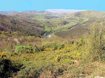Impresionante foto desde Siones contemplando el Nalón a su paso por Pintoria. A su izquierda la llanura aluvial con una enorme plantación de kiwis y sobre esta la línea de FEVE, Trubia-Collanzo. En la ladera del monte se conserva un nido de ametralladoras aún. La posición estratégica para controlar los convoyes ferroviarios erá evidente así como el paso por el camino entre Turbia y Caces que hoy se ha transformado en senda compartida con automóviles para enlazar con la Senda del Oso. Si te fijas podras ver un salmon. Al fondo el río Nalón.