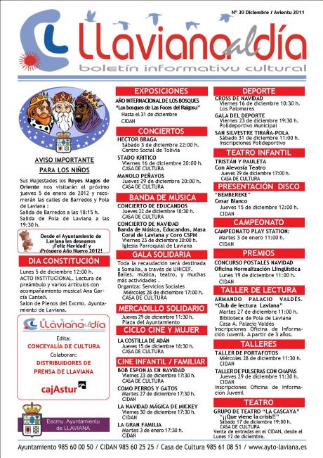 ... En la sala de usos multiples del CIDAN sigue la Exposición de LOS BOSQUES DE LES FOCES DEL RAIGOSU, Con ocasión del AÑO INTERNACIONAL DE LOS BOSQUES. Programacion Cultural para el mes de Diciembre de 2011. Ciclos de Cine, Conciertos de Musica, Exposiciones, talleres, teatro, etc... conforman una oferta cultural variada que Laviana ofrece a todos sus habitantes e inclouso a aquellos que llegan en su periodo vacacional o a visitar a la familia. BIENVENIDOS TODOS A ESTA VUESTRA CASA... QUE ES EL MUNICIPIO DE LAVIANA