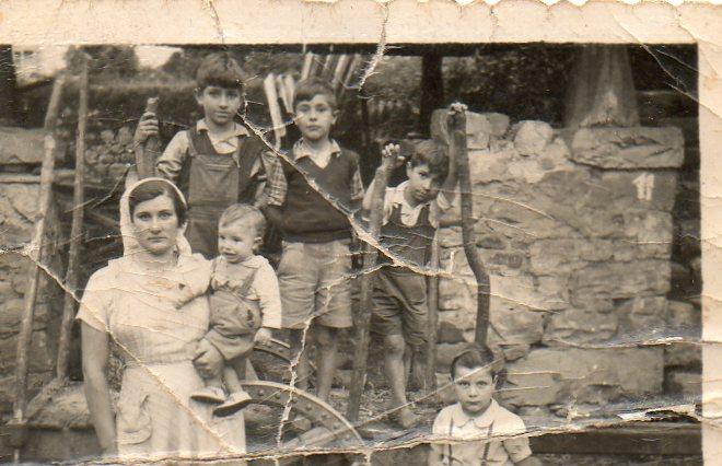 Hola foreros de Soto, la Sr. es Felicitas de cá Mela y el que está en el cuello de ella es Lalo, en el carro de izqui. a derech. Isaac, Raúl (sobrino de Encarnina de cá Pepón) y Jorge, en el suelo con tirantes Paquito, la foto es delante de cal Chispero en Soto y la hizo D. Alberto el de Lleiroso.