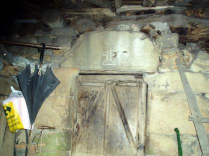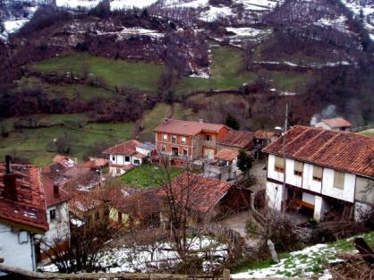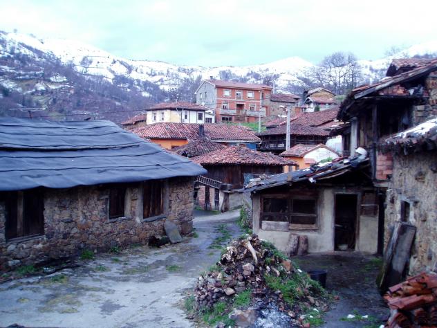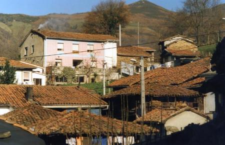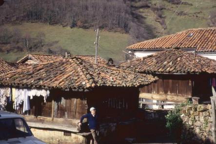Hórreos y panera en la Filera, al fondo la Rectoral antigua,