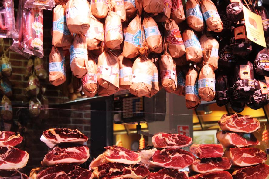 Escaparate de sobrasadas embutidos y jamones en el mercado del Olivar, PALMA DE MALLORCA