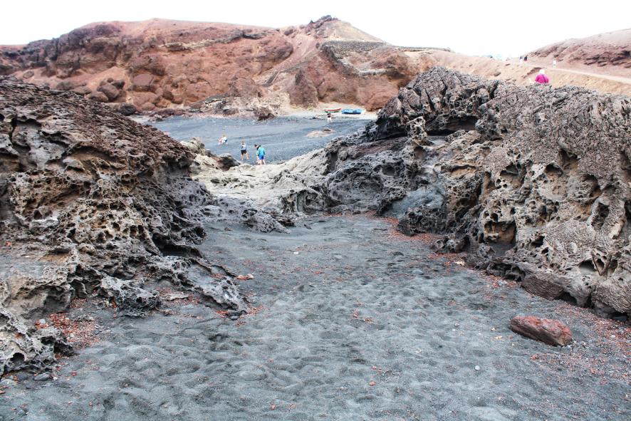 playa de arenas negras dentro de medio cráter volcánico en forma de anfiteatro geológico con distintas texturas de
