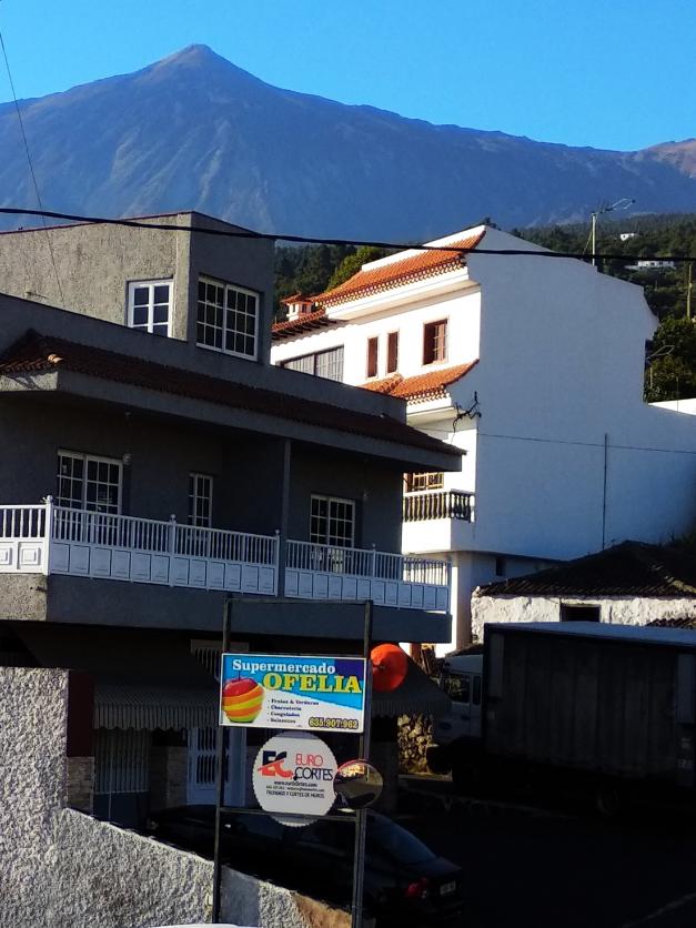 Pico del Teide: El volcán, que es el punto más alto de España, domina el horizonte. Desde esta zona de Icod, se aprecia su característica silueta cónica bajo un cielo despejado. Arquitectura Local: Los edificios muestran el estilo típico de las zonas residenciales de medianías en Tenerife, con fachadas blancas o grises y tejados de teja árabe naranja.