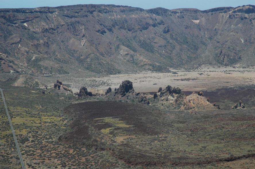 Yo aprecio un hoyo muy grande, que por mucho que llueva no puede llenarse de agua por la razones que explica Gema Medina la (porosidad de la piedra o tierra). Ahora aparecen restos de peces en los deshielos del polo norte de ciento veinte mil años de antigüedad, que estaban bajo la capa de hielo, mostrado por un iceberg. No es una caldera, en el Teide precisamente no se ha hundido ningún volcán dejando vacía toda la zona del cráter, si aquí intentarás llenarlo no podrías por dos razones: el terreno es muy poroso y no podría acumular, no se harían charcos, y segunda razón por una zona tienes este frente de roques que se levantaron impidiendo que la lava siguiera pasando por detrás de ellos, y este frente no rodea todo el Teide, creo recordar que solo están por una zona que llaman la Fortaleza. Preciosa foto donde apreciamos una caldera que parece ser no podemos llenar de agua.