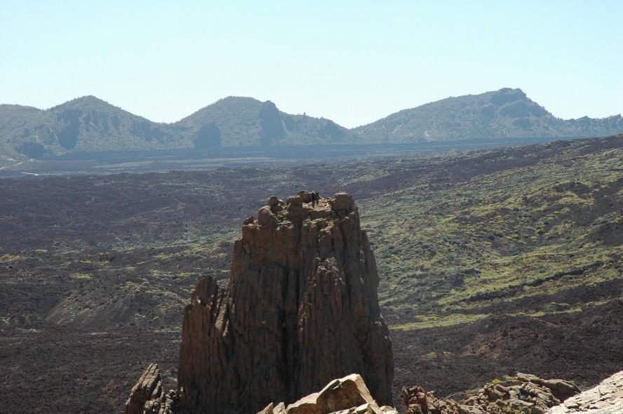 No hay ningún lago en esta zona, las rocas son demasiado porosas como para almacenar agua. Al fondo sobre la base de las montañas parece que hay un gran lago de agua, pero no puedo afirmarlo con certeza. Gracias. También se puede observar pasada la llanura una cadena montañosa en el horizonte, que bonito. Muchas gracias, yo estaba en los roques García y con el zoom pude sacar esa foto donde se ven los escaladores encima de un roque enorme y la llanura inmensa detrás. Fotografía espectacular, con escaladores en la cima del roque y toda una llanura detrás.