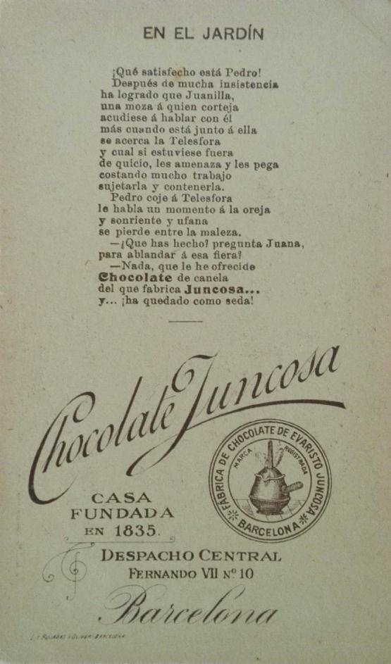 Barcelona, en 1.910. Los poemas del reverso de la tarjeta mezclan los estereotipos sobre Andalucía con la publicidad de su chocolate.