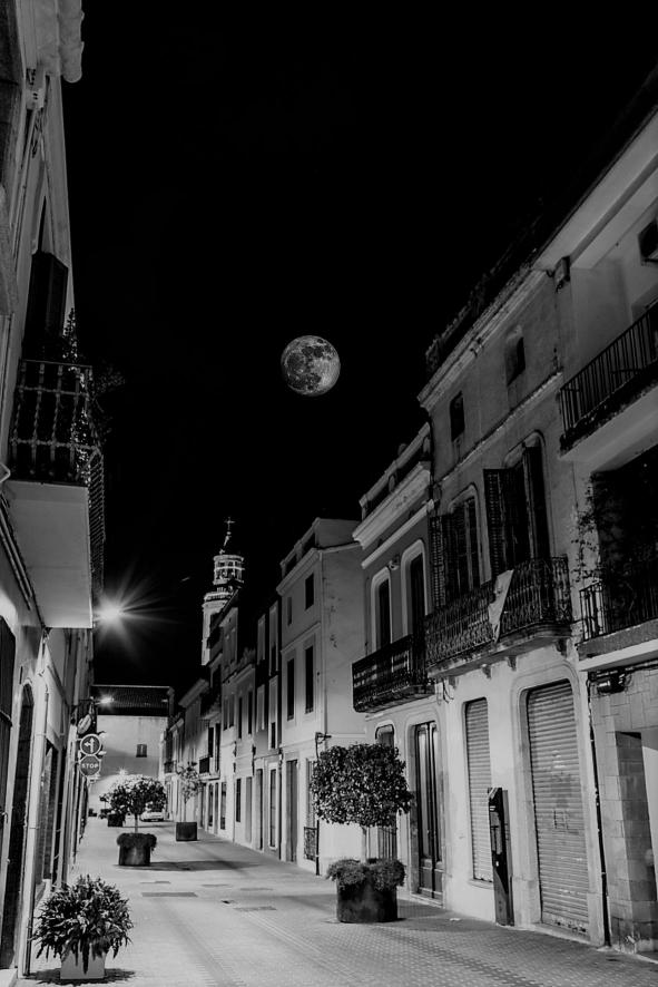 luna llena iluminando una calle casco antiguo,