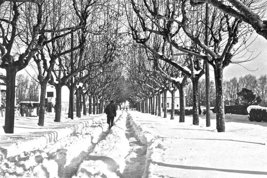 El caminante haciendo camino en la nieve (foto antigua),