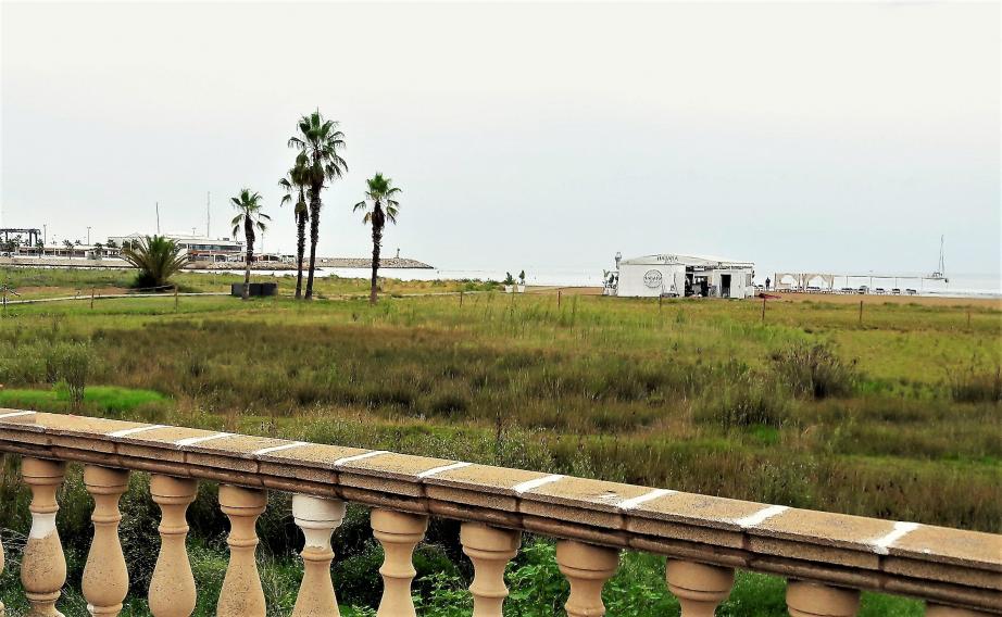 La playa de Ribes Roges con el muelle de poniente al fondo,