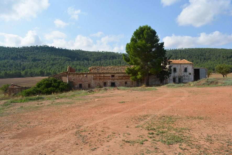 Vista frontal, desde la antigua era, de la Casa de campo o rural de La Lentiscosa. Situada en una extensa vaguada dentro del término municipal, muy cerca del río Cabriel.