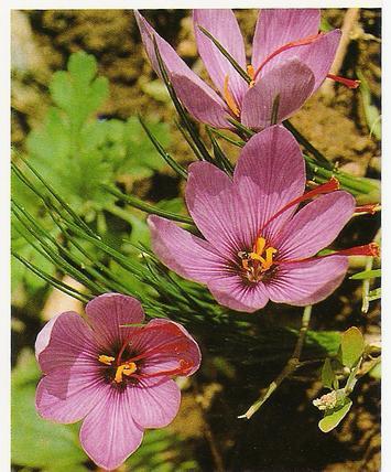 Sino también por el corazón. Planta herbácea perenne dotada de un bulbo subterráneo y de hojas lineales reforzadas por un nervio de color claro. La flor, de color violeta, está dividida en 6 lóbulos. Su estilo amarillo se separa en tres partes cada una de las cuales finaliza en un estigma color naranja. Desde siempre, el azafrán se ha cultivado en Asia como planta medicinal, colorante y culinaria. Inhalaciones o vapores.