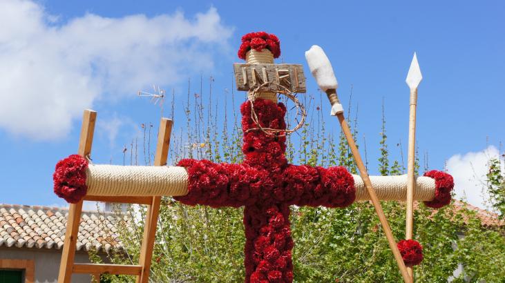 letrero de INRI y las cuerdas en los extremos de la Cruz, la cual esta realizada con claveles rojos simbolizando la sangre de