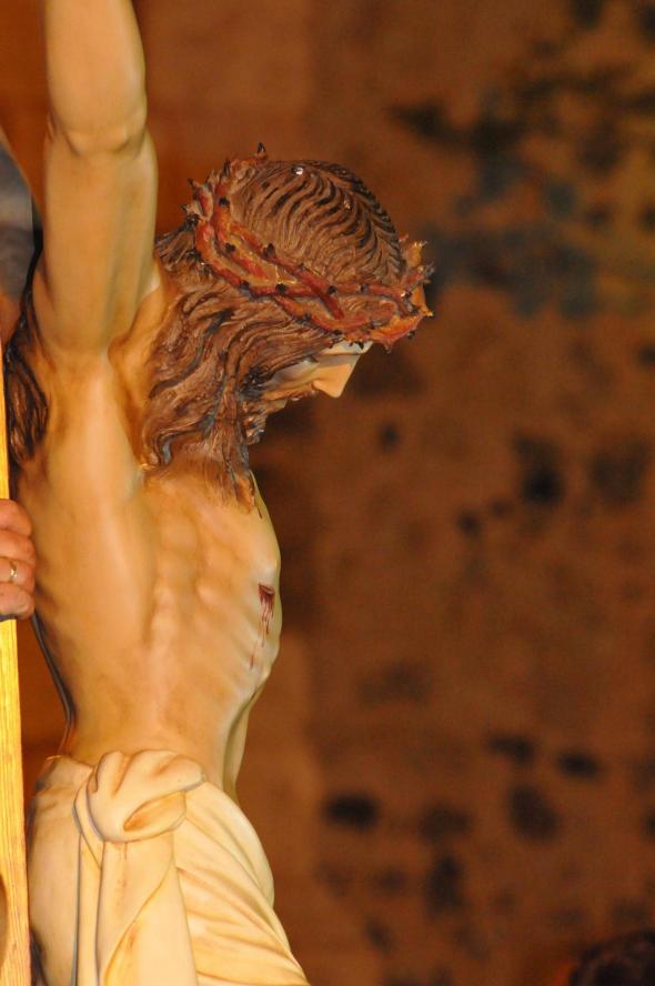 Se puede apreciar en este perfil la postura forzada del cuerpo de Cristo al estar clavado en la cruz, como tiene todo el cuerpo en tensión.