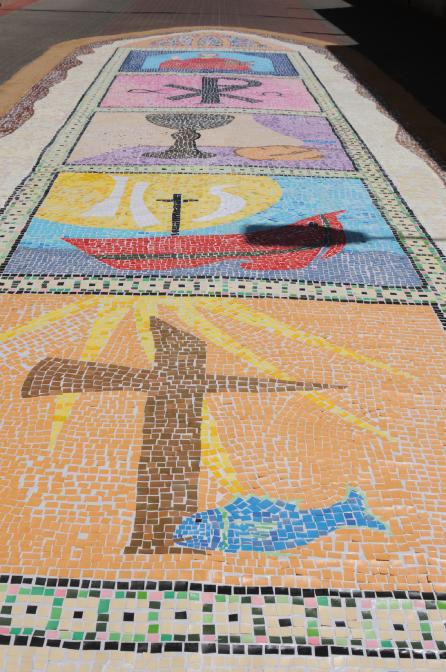 Es una alfombra muy bonita, primera imagen no la aprecio bien, segunda el crismón, tercera el cáliz, cuarta I H S con la cruz y una barca, quinta rayos de sol la posible figura de una letra y un pescado (pez) la primitiva señal de los cristianos cuando eran perseguidos en los tres primeros siglos por los romanos, la señal de la cruz aparece con la madre del emperador Constantino a partir del tercer siglo.