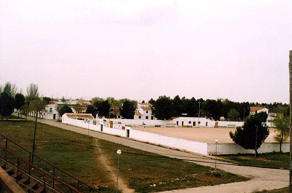 Campo de fútbol en color, y detrás el pueblo, CINCO CASAS