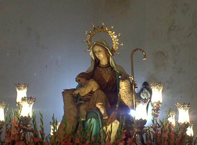 con la ovejas y el niño llevando el brazos,