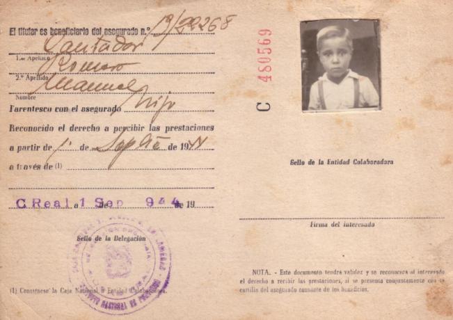 Contraportada del carnet de Identidad de la Seguridad Social de Isidoro Cantador, el interesado no estampó su firma por que aún no sabia escribir.