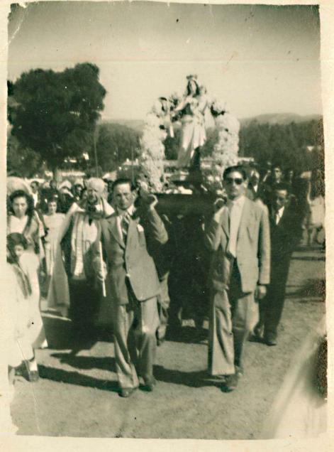 Parece ser que este año no va a ser como el de la fotografia 1946, yo tenia 5 años y los que portan a la Virgen, el de gafas JUANITO (hermano de nuestro amigo Paquillo) y mi tio JOSE "El Cano) y el cura Don JUAN con el que yo fui Monaguillo.