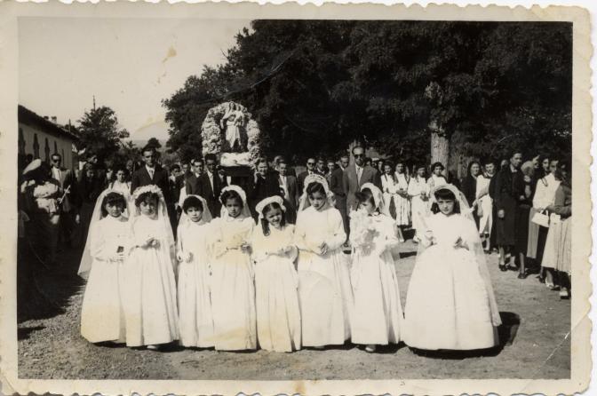 Con esta foto puede que se identifique más el año en que se tomó la anterior que he enviado donde aparece mi padre llevandola en andas. Seguro que estas niñas recuerdan bien el año de su primera comunión
