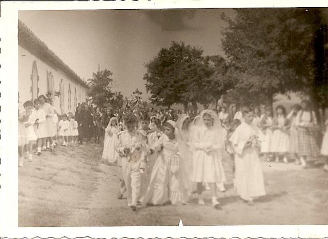 Un abrazo. Soy Emilio Escobar, el primero de la izquierda y a mi lado va Purificacion Ramon hija de Pepe el guarda. En el otro extremo creo que es Manuel López, hijo de Pedro López Que linda foto, yo estaría en esa foto pero en mantillas... nací ese año. Señor Escobar por favor comentenos sus fotos. Bonita foto, Yo también creo que estoy en ella aunque no me veo pero tomé la 1ª comunión ese mismo año. Gracias efescobarb