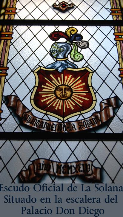 Este es el Escudo Oficial de la Villa de La Solana. Este bello consta de: En campo de azur un astro Sol, todo ello bajo las armas y yelmo del Marques de Santa Cruz que otorgó a la población el título de Villa