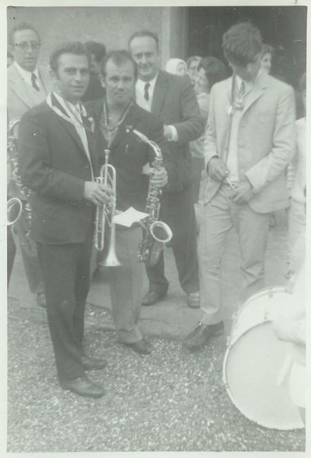 Bajando de la romería los músicos de Hinojosas, ORQUESTA FERNANDEZ, se hicieron esta bonita foto con su paisano, mi padre, en ella aparece también en primer`plano Francisco Paz. A las otras personas no las identifico.