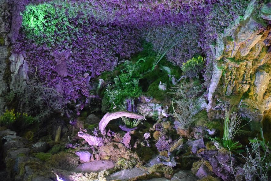 Decoración en el interior de una cueva artificial para colocar una Cruz de Mayo,