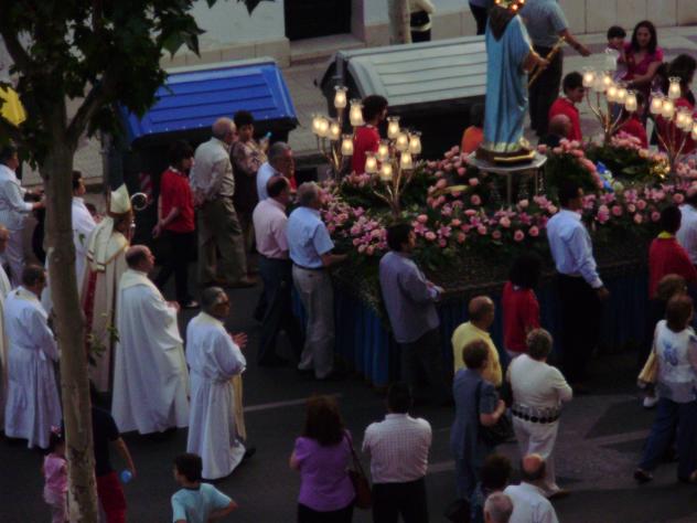se ve al Sr Obispo, que ha presidido los actos de hoy, y ha acompañado a la imagen en todo su recorrido acompañado de ocho sacerdotes en representacion no solo de los Salesianos sino del resto de
