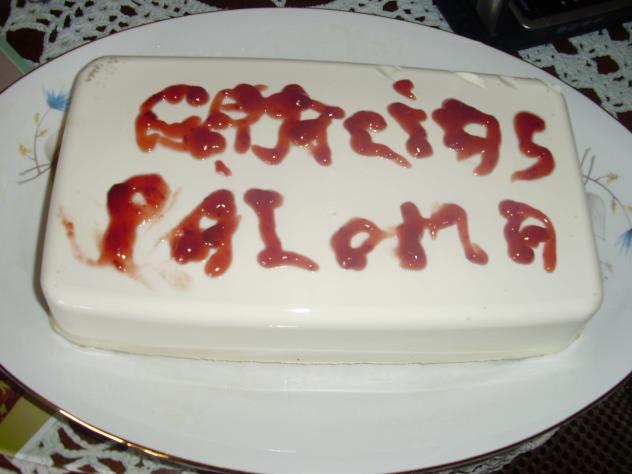 Paloma, este mensaje va para ti, gracias por el postre que hoy hemos compartido en familia, está bueniiisimo, no quise echarle la mermelada por encima para hacer esto que hice, darte las gracias con mermelada de fresa, pero ya ves... iba un poco apurada de tiempo y las letras salieron jhechas un churro, pero creo se entiende no? por si es que no.... ahi quise y puse... GRACIAS PALOMA.