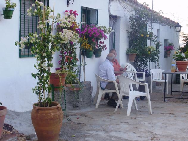Mira Obdulio, como atiende a Antonio en la conversación, mientras el perfume de las Buganvillas hace que el aire quede impregnado de su aroma… mientras ellos estan en animada charla me parece que voy a acurrucarme, porque seguro con el sonido de sus voces de fondo me quedo dormida.... Algo debian estar tramando entre los dos, eso está claro, y para nada me extrañaria hicieran un acuerdo sobre el tema helado jejejej Loli creo que estaban "discutiendo" sobre el sabor del helado que se iban a comer antes de que llegaramos. Que estarian hablando los dos en tan animada charla... nosotros nos fuimos a dar un paseo y ellos se quedaron ahi, en ese bonito lugar, la verdad que es una gozada, estar a gusto, y ademas con mas fresquito que aqui... cuando nos veniamos habia solo 20º