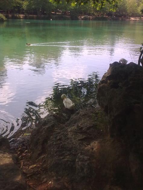 Ese pato nadador se parece a mi, me gusta cuando nado hacerlo en soledad, bueno no es eso exactamente sino que no me gusta ver que no hay nadie cerca que pueda gastarme alguna broma o alguna ahogadilla, el agua me da respeto y por eso prefiero ir yo tranquilamente y a mi aire, aunque en esta foto parece que el pato estuviera compitiendo, lo digo porque tiene animadores que le observan jejeje, bonito enclave tambien el de esta foto para estar sentado en esa roca observando o comiendose el bocata,...