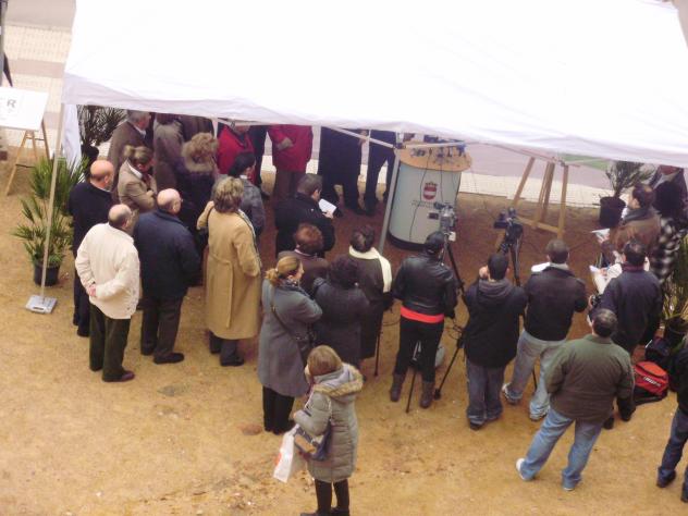 jejej seria por eso.... Eso de comenzar antes de la hora seria porque se les echaba la hora del vermut encima je. je… Bueno aqui estan estas fotos, aun calentitas, es el comienzo del acto de la puesta de la primera piedra, ha sido antes de la hora prevista, pues tenia idea de que seria a las 12, y a las 11.30 ya estaban, asi que esta la hice desde mi balcón, por eso no se ve a las personas que dentro de la carpa se encuentran....