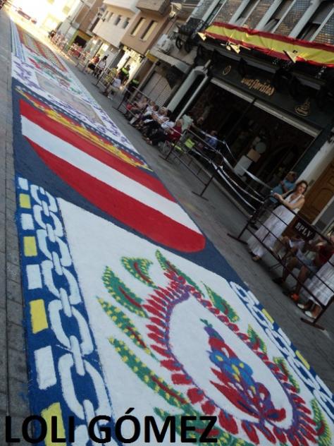 El escudo de Puertollano cerca de la Virgen no podia faltar tampoco, y ya veis que a la hora que hice la foto, que serian las 7.30 de la tarde ya habia algunas personas sentadas esperando el paso de la Patrona, anda que la sentada que se pegaron fué chica hasta que Ella llegó...