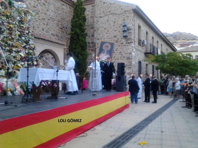 Pues bien, aqui podeis apreciar el cuadro del que os hablé, en este momento ha terminado el Rosario y estan subiendo los que lo han portado a hombros sobre las andas para dejarlo en la ubicacion destinada antes de dar comienzo la Santa Misa