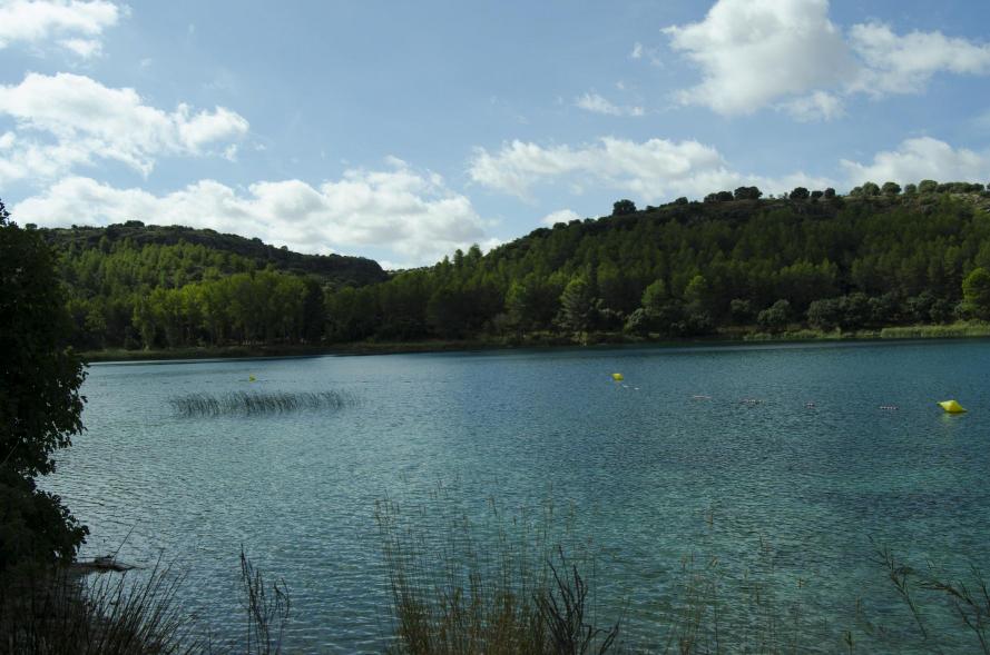 , con su azul turquesa y los juncos sobresaliendo, en un día tranquilo