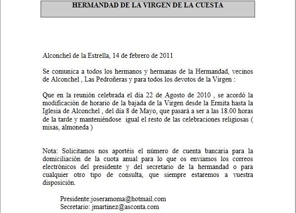 comunicado oficial de la junta de la hermandad de la virgen de la cuesta.