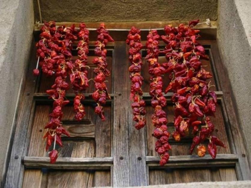 Vemos este secadero de pimientos que es artesanal, es una cuerda donde cuelgan la ristras de los pimientos rojos.
