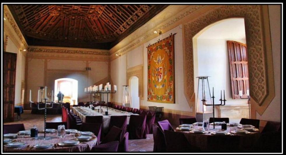 En esta fotografia vemos el salon del trono del castillo de belmonte de Cuenca que esta preparado para ofrecer un banquete a los comensales que asistiran al acto que se celebrara en homenaje a unos recien casados, que aproveche. comentario