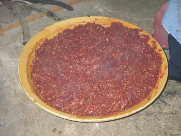 La cebolla, la manteca, la sangre y las especias se mezclan, con lo que todo está listo para meterlo en la tripa.