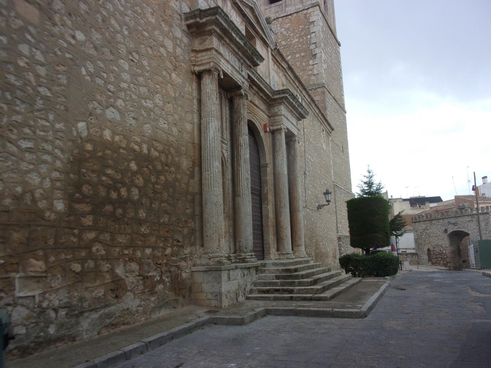 Portada norte de la iglesia de Nuestra Señora de la Asunción, TARANCON Es obra de Pedro de Solórzano, tiene un arco de medio punto y dos pares de columnas jónicas estriadas. (12 de Noviembre de 2022)