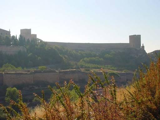 Vista del Monasterio o mejor dicho de "El Convento de Santiago" desde la carretera de entrada al pueblo desde Madrid, en el lugar llamado "El Portillo", por ser un pequeño puerto de entrada al pueblo entre rocas. Las torres gemelas del castillo están restauradas, pero la Torre Albarrana aún no estaba restaurada en esta fotografía, aunque actualmente ya lo está.
