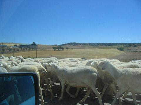 Aquí los embotellamientos son de los que te ponen de mal humor. Este de Villalgordo me hizo gracia, pues volvíamos de Villar de la Encina de buscar el pan calentito para desayunar, y ese día nuestro desayuno quedó a merced de las ovejas.