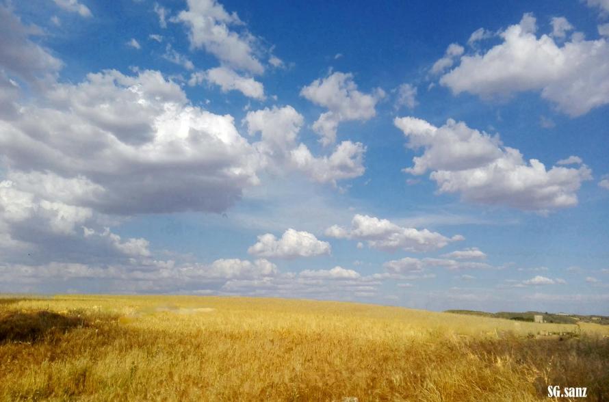 Trigal, cielo azul y nubes,