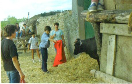 Los que estan sentados en la valla son Sergio el hijo de Marcos y Albertito el nieto de la Aurora y Pedro Gil, el que torea es Jorge el nieto de la Flora, el de detras es Marino el hijo de la Elvira, el de al lado de Jorge creo que es Raúl o Miguel los sobrinos de Cecilio, y el de la camiseta negra no tengo ni idea... Quienes son los de la foto??