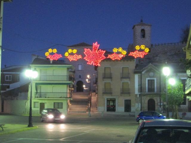 Ayuntamiento e iglesia tras la iluminación navideña,