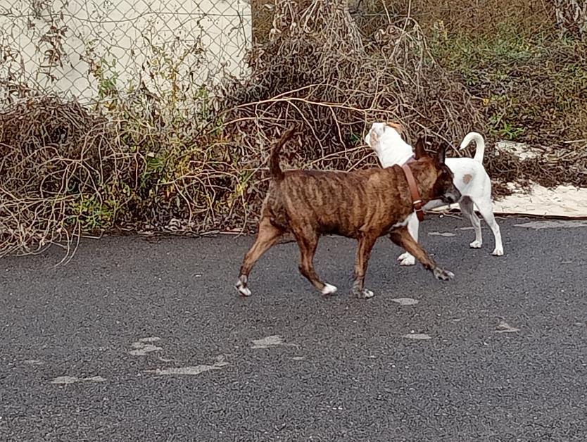 Una pareja de perritos conociéndose,