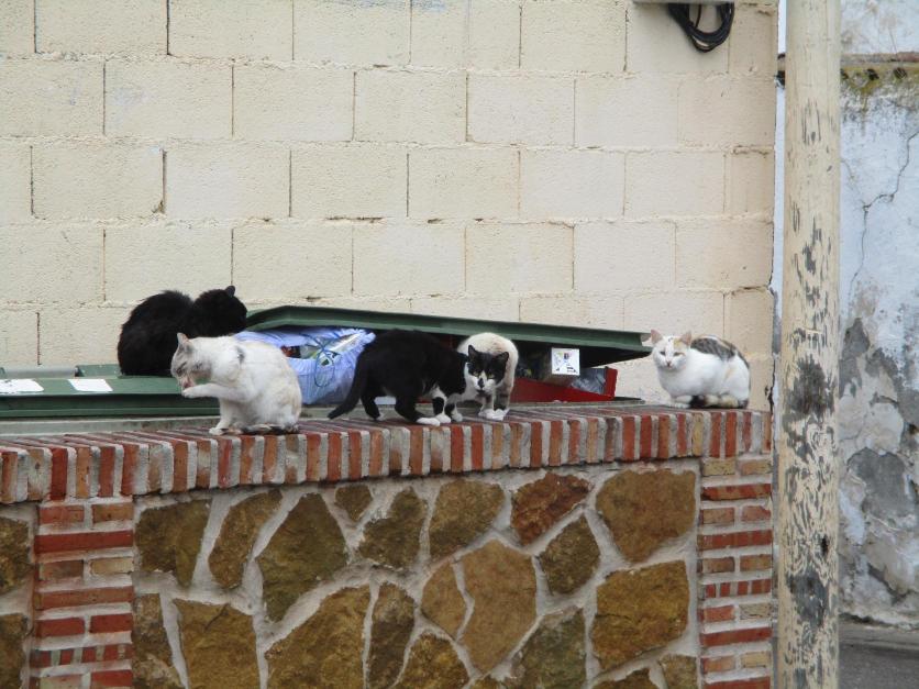 Grupo de gatos sobre los contenedores de basura de la plaza,
