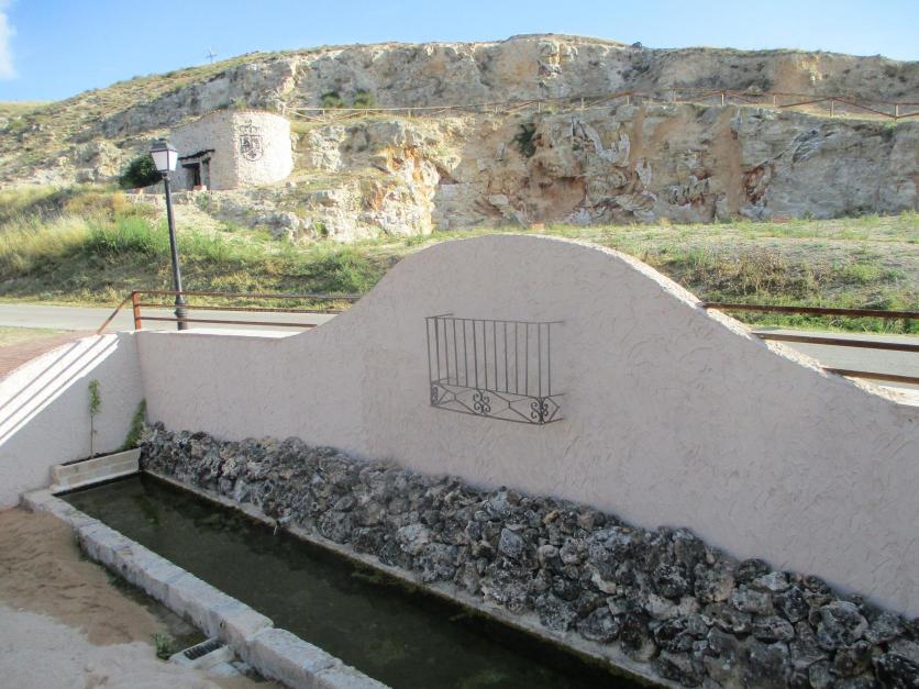 La fuente de las mulas y detrás el cerro de la antigua yesería,